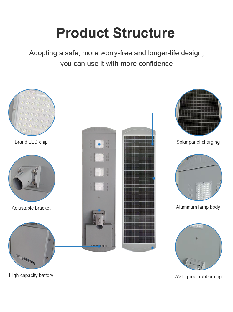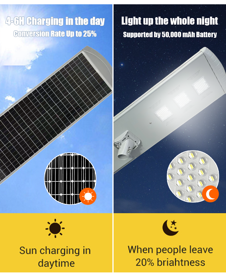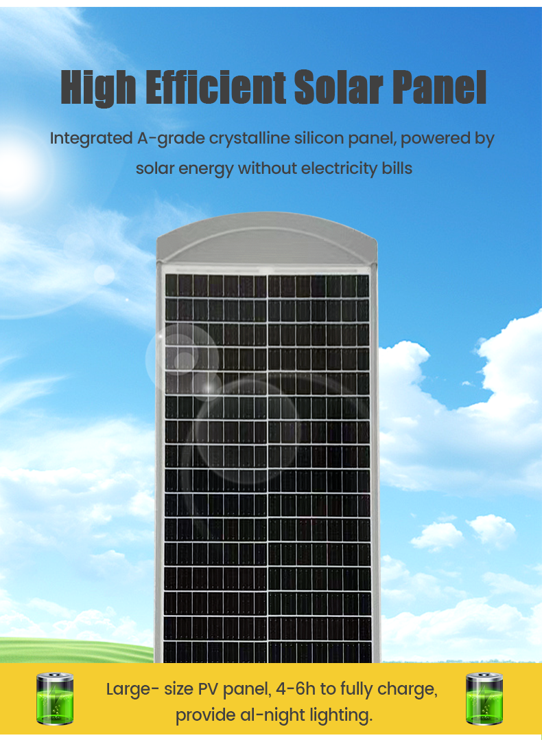 Integrated solar LED street lights are street lights that use solar panels to harness sunlight and convert it into electricity to power LED lights. These street lights are designed to be self-sufficient and do not rely on the grid for power supply. The solar panels are typically installed on top of the street light pole, facing the sun. During the day, the solar panels absorb sunlight and charge the battery stored within the street light pole. At night, the battery powers the LED lights, providing illumination to the streets.